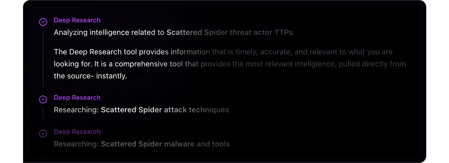 Ask any threat intelligence question. AgentCypher searches, correlates findings, and synthesizes comprehensive reports, within minutes.