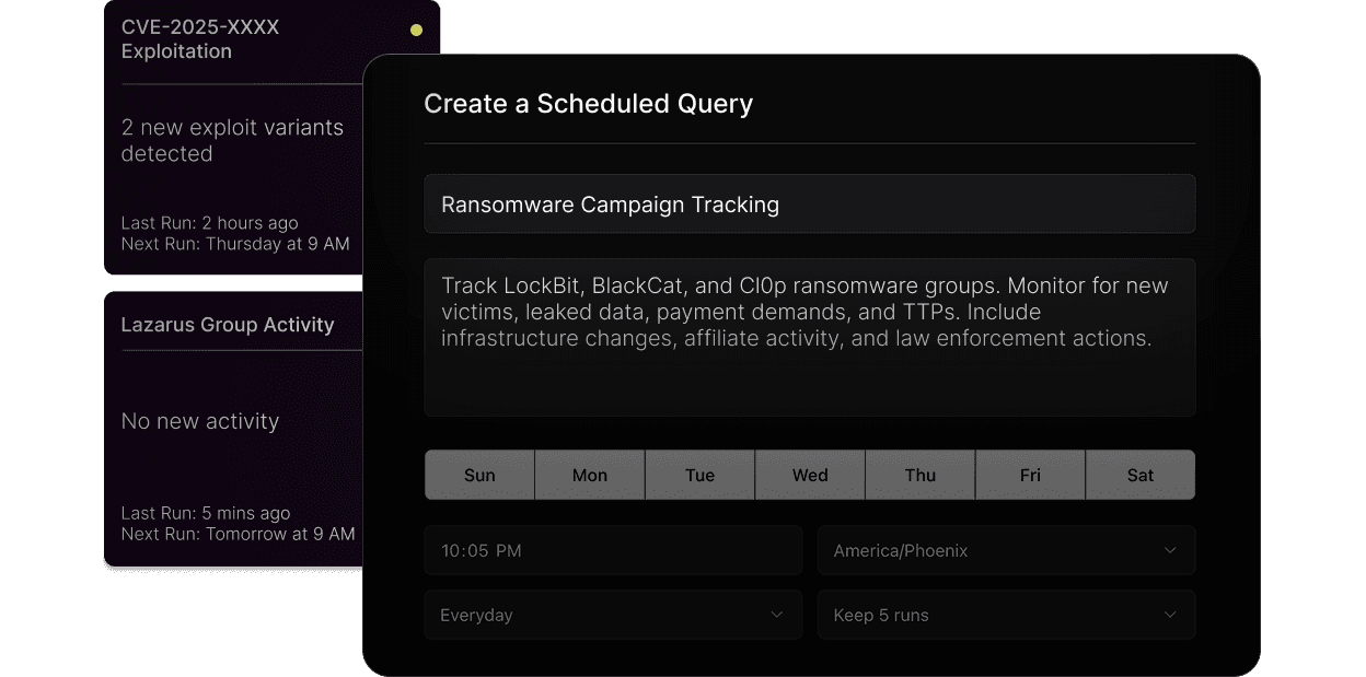 Set recurring investigations to run automatically. Monitor threat actors, track vulnerabilities, or watch infrastructure without lifting a finger.
