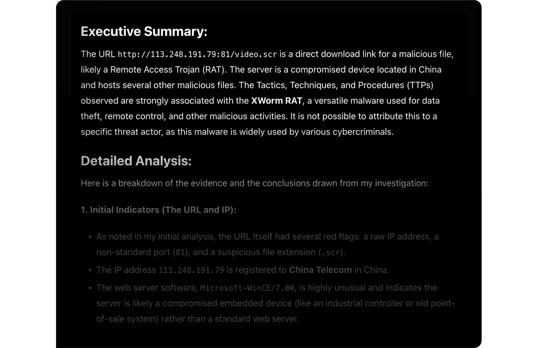 Get a comprehensive, structured report with executive summary, technical analysis, IOCs, and recommended actions.